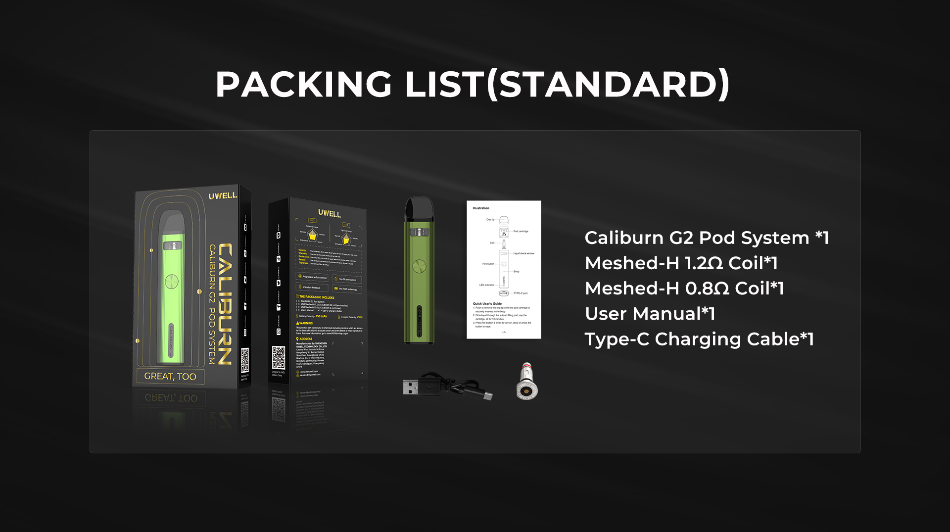 | Uwell Caliburn G2 | 黑色套裝, 藍色套裝, 紅色套裝, 橘色漸層套裝, 軍綠色套裝, 漸層藍紫套裝, 灰色套裝, 海洋漸層套裝, 漸層藍色套裝, 原廠G2空倉兩入, 0.8歐姆成品芯(4入), 1.0歐姆成品芯(4入), 1.2歐姆成品芯(4入), 優惠套組(主機+日本煙油)下單後私訊客服 |